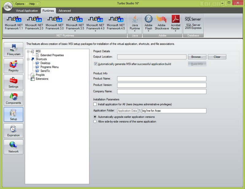 Incorpore dependências de tempo de execução como .NET, Java, AIR e SQL CE diretamente em aplicativos virtuais. Inicie em desktops completamente limpos.